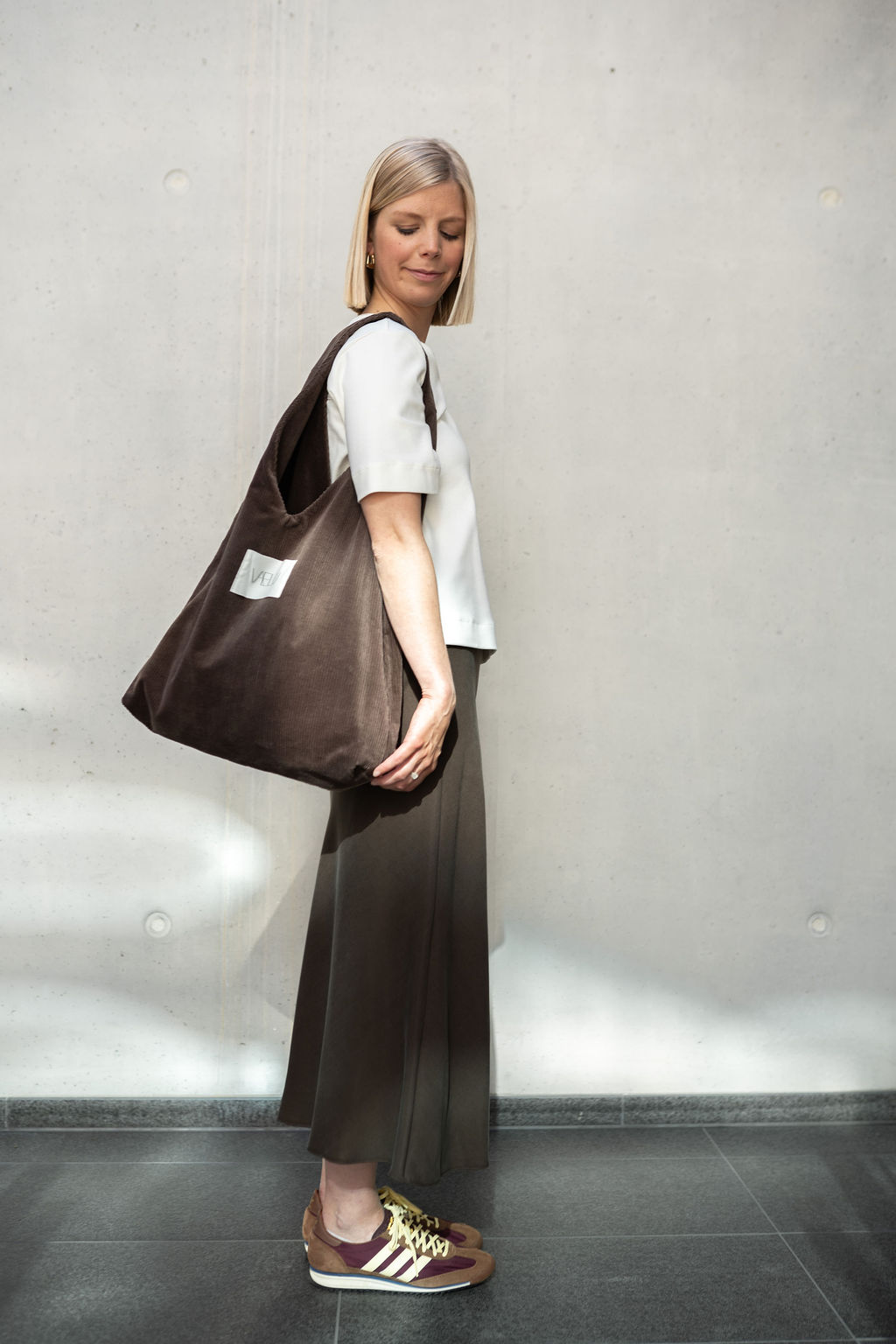 Für unsere Tasche haben wir einen wunderschönen Cordstoff „upgecycled“ und ihm so ein zweites Leben geschenkt. Aus einzelnen Reststücken haben wir in liebevoller Detailarbeit eine besondere Variante unserer Tasche SVANTY.E kreiert.